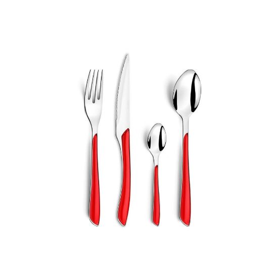 Moderne et acidulée, la gamme Eclat réveille votre table. Ensemble de 24 couverts pour 6 personnes. Manche couleur rouge. Acier inox, lame microdentée et finition brillante.