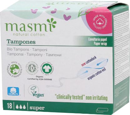Tampons 100% cotton bio flux régulier sans applicateur Masmi, 18 unités